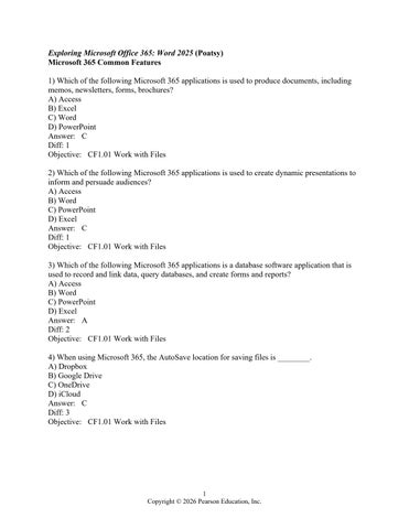 Exploring Microsoft Office 365: Word 2025 (Poatsy) Microsoft 365 Common Features 1) Which of the following Microsoft 365 applications is used to produce documents, including memos, newsletters, forms, brochures? A) Access B) Excel C) Word D) PowerPoint Answer: C Diff: 1 Objective: CF1.01 Work with Files 2) Which of the following Microsoft 365 applications is used to create dynamic presentations to inform and persuade audiences? A) Access B) Word C) PowerPoint D) Excel Answer: C Diff: 1 Objective: CF1.01 Work with Files 3) Which of the following Microsoft 365 applications is a database software application that is used to record and link data, query databases, and create forms and reports? A) Access B) Word C) PowerPoint D) Excel Answer: A Diff: 2 Objective: CF1.01 Work with Files 4) When using Microsoft 365, the AutoSave location for saving files is ________. A) Dropbox B) Google Drive C) OneDrive D) iCloud Answer: C Diff: 3 Objective: CF1.01 Work with Files