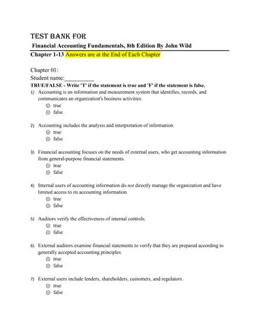 Test Bank For Financial Accounting Fundamentals, 8th Edition By John Wild Chapter 1-13 Answers are at the End of Each Chapter Chapter 01: Student name:__________ TRUE/FALSE - Write 'T' if the statement is true and 'F' if the statement is false. 1) Accounting is an information and measurement system that identifies, records, and communicates an organization's business activities. ⊚ true ⊚ false 2) Accounting includes the analysis and interpretation of information. ⊚ true ⊚ false 3) Financial accounting focuses on the needs of external users, who get accounting information
