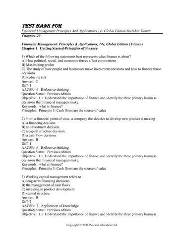 Test Bank for Financial Management Principles And Applications 14e Global Edition Sheridan Titman Chapter1-20 Financial Management: Principles & Applications, 14e, Global Edition (Titman) Chapter 1 Getting Started-Principles of Finance 1) Which of the following statements best represents what finance is about? A) How political, social, and economic forces affect corporations B) Maximizing profits C) The study of how people and businesses make investment decisions and how to finance those decisions. D) Reducing risk Answer: C Diff: 1 AACSB: 6. Reflective thinking Question Status: Previous edition Objective: 1.1 Understand the importance of finance and identify the three primary business decisions that financial managers make. Keywords: what is finance? Principles: Principle 3: Cash flows are the source of value 2) From a financial point of view, a company that decides to develop new product is making A) a financing decision. B) an investment decision. C) a capital structure decision. D) a cash flow decision. Answer: B Diff: 1 AACSB: 6. Reflective thinking Question Status: Previous edition Objective: 1.1 Understand the importance of finance and identify the three primary business decisions that financial managers make. Keywords: what is finance? Principles: Principle 3: Cash flows are the source of value 3) Working capital management refers to A) long-term financing decisions. B) the management of cash flows. C) investing in product development. D) capital structure. Answer: B Diff: 2 AACSB: 7. Application of knowledge Question Status: Previous edition Objective: 1.1 Understand the importance of finance and identify the three primary business 1 Copyright © 2021 Pearson Education Ltd.