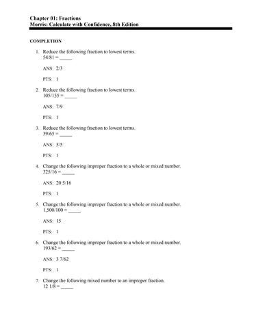 Chapter 01: Fractions Morris: Calculate with Confidence, 8th Edition COMPLETION 1. Reduce the following fraction to lowest terms.