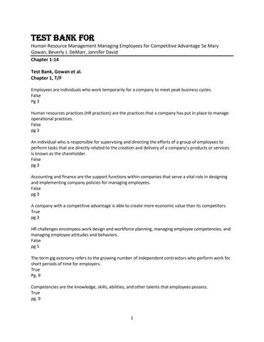 Test Bank For Human Resource Management Managing Employees for Competitive Advantage 5e Mary Gowan, Beverly J. DeMarr, Jannifer David Chapter 1-14 Test Bank, Gowan et al. Chapter 1, T/F Employees are individuals who work temporarily for a company to meet peak business cycles. False Pg 3 Human resources practices (HR practices) are the practices that a company has put in place to manage operational practices. False pg 3 An individual who is responsible for supervising and directing the efforts of a group of employees to perform tasks that are directly related to the creation and delivery of a company’s products or services is known as the shareholder. False pg 3 Accounting and finance are the support functions within companies that serve a vital role in designing and implementing company policies for managing employees. False pg 3 A company with a competitive advantage is able to create more economic value than its competitors. True pg 3 HR challenges encompass work design and workforce planning, managing employee competencies, and managing employee attitudes and behaviors. False pg 5 The term gig economy refers to the growing number of independent contractors who perform work for short periods of time for employers. True Pg. 9 Competencies are the knowledge, skills, abilities, and other talents that employees possess. True pg. 9