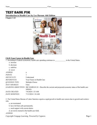 Ch 01 Your Career in Health Care 1. According to Federal economists, health care spending continues to ____________ in the United States. a. increase b. decrease c. stabilize d. waver ANSWER: a POINTS: 1 DIFFICULTY: Understand REFERENCES: Your Future in Health Care QUESTION TYPE: Multiple Choice HAS VARIABLES: False LEARNING OBJECTIVES: IHC.HARO.01.01 - Describe the current and projected economic status of the health care industry. DATE CREATED: 7/8/2024 1:33 AM DATE MODIFIED: 7/13/2024 1:34 AM 2. The United States Bureau of Labor Statistics reports a rapid growth in health care careers due to growth and workers who a. are terminated. b. have left their jobs permanently. c. need support with current duties. d. are newly trained in the health care field. ANSWER: b