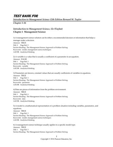 Test Bank for Introduction to Management Science 12th Edition Bernard W. Taylor Chapter 1-16 Introduction to Management Science, 12e (Taylor) Chapter 1 Management Science 1) A management science solution can be either a recommended decision or information that helps a manager make a decision. Answer: TRUE Diff: 2 Page Ref: 5 Section Heading: The Management Science Approach to Problem Solving Keywords: model, management science techniques AACSB: Analytical thinking