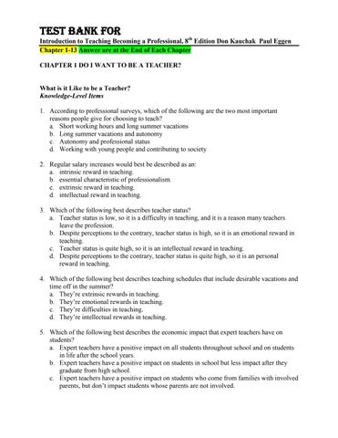 Test Bank For Introduction to Teaching Becoming a Professional, 8th Edition Don Kauchak Paul Eggen Chapter 1-13 Answer are at the End of Each Chapter CHAPTER 1 DO I WANT TO BE A TEACHER?