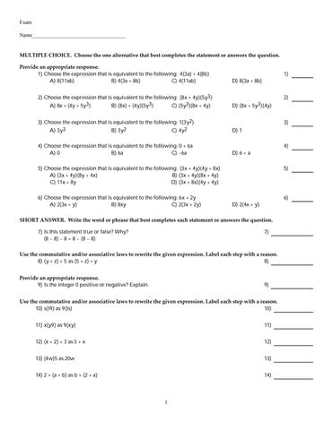 MULTIPLE CHOICE. Choose the one alternative that best completes the statement or answers the question. Provide an appropriate response. 1) Choose the expression that is equivalent to the following: 4(3a) + 4(8b) A) 8(11ab) B) 4(3a + 8b) C) 4(11ab) 2) Choose the expression that is equivalent to the following: (8x + 4y)(5y3 ) A) 8x + (4y + 5y3 ) B) (8x) + (4y)(5y3 ) C) (5y3 )(8x + 4y)