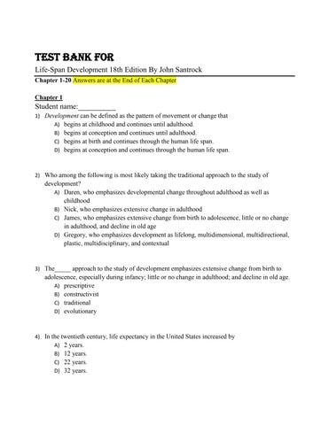 Test Bank For Life-Span Development 18th Edition By John Santrock Chapter 1-20 Answers are at the End of Each Chapter Chapter 1