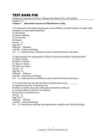 Test Bank For Management Information Systems: Managing the Digital Firm, 18e (Laudon) Chapter 1-15 Chapter 1 Information Systems in Global Business Today 1) As discussed in the chapter-opening case, ConocoPhillips solved the problem of supply chain challenges by using which technology? A) 3D printing B) cloud computing C) 5G networks D) Intranet Answer: A Page Ref: 5 Difficulty: Moderate AACSB: Analytical thinking LO: 1.1: Understand how information systems transform business and careers. 2) Approximately how many people in 2024 are expected to purchase something online? A) About 1 billion B) About 2.9 billion C) About 3.5 billion D) About 4.25 billion Answer: B Page Ref: 10 Difficulty: Moderate AACSB: Information technology LO: 1.1: Understand how information systems transform business and careers. 3) All of the following describe the effects of globalization except ________. A) significant decreases in operating costs B) ability to reliably obtain price and quality information worldwide C) increased ability to find low-cost suppliers D) increases in transaction costs Answer: D Page Ref: 17 Difficulty: Difficult AACSB: Analytical thinking LO: 1.2: Describe key challenges and opportunities created by new MIS technologies.