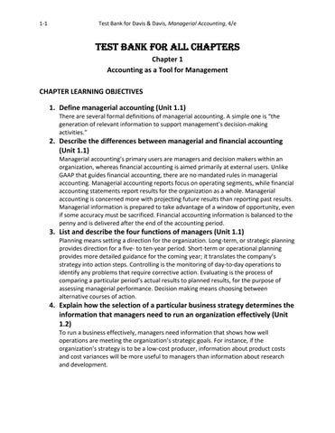 Test Bank for All Chapters Chapter 1 Accounting as a Tool for Management CHAPTER LEARNING OBJECTIVES 1. Define managerial accounting (Unit 1.1) There are several formal definitions of managerial accounting. A simple one is “the generation of relevant information to support management’s decision-making activities.”