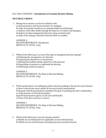 File: Ch01; CHAPTER 1: Introduction to Economic Decision Making MULTIPLE CHOICE 1. Managerial economics can best be defined as the: a) macroeconomics and microeconomics for managers. b) study of economic incentives on consumer behavior and demand. c) analysis of the labor market through the behavior of workers and managers. d) analysis of major management decisions using economic tools. e) study of the strategic interaction between firms in a market. ANSWER: d SECTION REFERENCE: Introduction DIFFICULTY LEVEL: Easy
