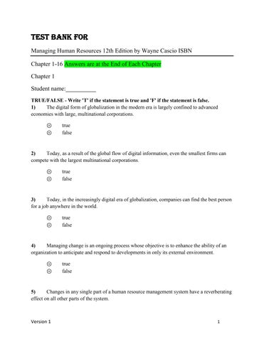 Test Bank for Managing Human Resources 12th Edition by Wayne Cascio ISBN Chapter 1-16 Answers are at the End of Each Chapter Chapter 1 Student name:__________ TRUE/FALSE - Write 'T' if the statement is true and 'F' if the statement is false. 1) The digital form of globalization in the modern era is largely confined to advanced economies with large, multinational corporations. ⊚ ⊚