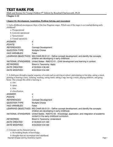 Test Bank For Math and Science for Young Children 9th Edition by Rosalind Charlesworth, Ph.D Chapter 1-12 Chapter 01: Development, Acquisition, Problem Solving, and Assessment 1. Early childhood encompasses three of the four Piagetian stages. Which one of the stages is not reached during early childhood? a. Preoperational b. Concrete operational c. Sensorimotor d. Formal operations ANSWER: d POINTS: 1 REFERENCES: Concept Development QUESTION TYPE: Multiple Choice HAS VARIABLES: False LEARNING OBJECTIVES: MS.CHAR.09.01.01 - Define concept development, and identify the concepts children are developing in early childhood. NATIONAL STANDARDS: United States - NAEYC-01 - Child development and learning in context. KEYWORDS: Bloom’s Taxonomy: Apply DATE CREATED: 4/18/2024 4:38 AM DATE MODIFIED: 4/23/2024 5:04 AM 2. A child goes through a regular sequence of events such as arriving at school, participating in free play, eating a snack, painting or hearing a story, toileting, washing, eating lunch, taking a nap, having a snack, playing outdoors, and going home. The concept this child is learning is a. size. b. space. c. time. d. classification. ANSWER: c POINTS: 1 REFERENCES: Concept Development QUESTION TYPE: Multiple Choice HAS VARIABLES: False LEARNING OBJECTIVES: MS.CHAR.09.01.01 - Define concept development, and identify the concepts children are developing in early childhood. NATIONAL STANDARDS: United States - NAEYC-05 - Knowledge, application, and integration of academic content in the early childhood curriculum. KEYWORDS: Bloom’s Taxonomy: Understand DATE CREATED: 4/18/2024 4:41 AM DATE MODIFIED: 4/23/2024 5:04 AM 3. Concepts can be characterized as a. the building blocks of knowledge. b. thoughts that are incomplete until adulthood. Copyright Cengage Learning. Powered by Cognero.