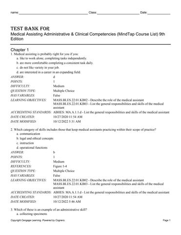 Test Bank For Medical Assisting Administrative & Clinical Competencies (MindTap Course List) 9th Edition Chapter 1 1. Medical assisting is probably right for you if you: a. like to work alone, completing tasks independently. b. are more comfortable completing a consistent task daily. c. do not like variety in your job. d. are interested in a career in an expanding field. ANSWER: d POINTS: 1 DIFFICULTY: Medium QUESTION TYPE: Multiple Choice HAS VARIABLES: False LEARNING OBJECTIVES: MASS.BLES.22.01.KB02 - Describe the role of the medical assistant MASS.BLES.22.01.KB03 - List the general responsibilities and skills of the medical assistant ACCREDITING STANDARDS: ABHES: MA.A.1.1.d - List the general responsibilities and skills of the medical assistant DATE CREATED: 10/27/2020 11:54 AM DATE MODIFIED: 10/12/2022 5:31 AM 2. Which category of skills includes those that keep medical assistants practicing within their scope of practice? a. communication b. legal and ethical concepts c. instruction d. operational functions ANSWER: b POINTS: 1 DIFFICULTY: Medium REFERENCES: Figure 1-4 QUESTION TYPE: Multiple Choice HAS VARIABLES: False LEARNING OBJECTIVES: MASS.BLES.22.01.KB02 - Describe the role of the medical assistant MASS.BLES.22.01.KB03 - List the general responsibilities and skills of the medical assistant ACCREDITING STANDARDS: ABHES: MA.A.1.1.d - List the general responsibilities and skills of the medical assistant DATE CREATED: 10/27/2020 11:54 AM DATE MODIFIED: 10/12/2022 5:46 AM 3. Which of these is an example of an administrative skill? a. collecting specimens Copyright Cengage Learning. Powered by Cognero.