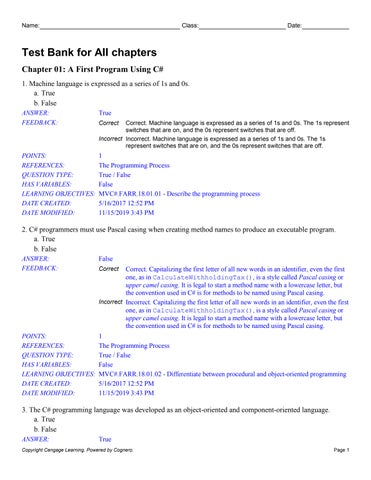 Test Bank for All chapters Chapter 01: A First Program Using C# 1. Machine language is expressed as a series of 1s and 0s. a. True b. False ANSWER: FEEDBACK: