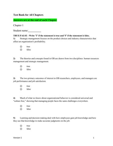 Test Bank for All Chapters Answers are at the end of each Chapter Chapter 1 Student name:__________ TRUE/FALSE - Write 'T' if the statement is true and 'F' if the statement is false. 1) Strategic management focuses on the product choices and industry characteristics that affect an organization’s profitability. ⊚ ⊚