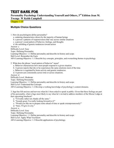Test Bank For Personality Psychology Understanding Yourself and Others, 3rd Edition Jean M. Twenge W Keith Campbell Chapter 1-15