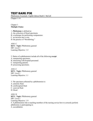 Chapter 1 Multiple Choice 1. Phlebotomy is defined as: A. the collection of blood specimens. B. a technique for performing venipuncture. C. an incision into a vein. D. the practice of “bloodletting.” ANS: C KEY: Topic: Phlebotomy general DIF: Level 1 Learning Objective: 1.2