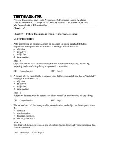Test Bank For Physical Examination and Health Assessment, 2nd Canadian Edition by Marian Luctkar-Flude (Editor) Carolyn Jarvis (Author), Annette J. Browne (Editor), June MacDonald-Jenkins (Editor) (Author) Chapter 1-31 Chapter 01: Critical Thinking and Evidence-Informed Assessment MULTIPLE CHOICE 1. After completing an initial assessment on a patient, the nurse has charted that his
