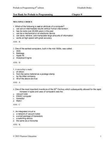 MULTIPLE CHOICE 1. Which of the following is not an attribute of a computer? a. can act on intermediate results without human intervention b. has its roots over 20,000 years in the past c. can be a mechanical or an electronic device d. can store, retrieve, and manipulate large amounts of information e. works at high speed with great accuracy ANS: B