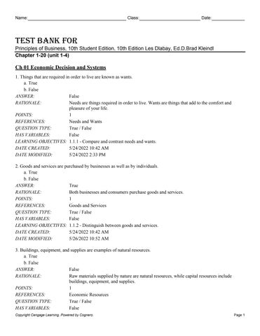 Ch 01 Economic Decision and Systems 1. Things that are required in order to live are known as wants. a. True b. False ANSWER: False RATIONALE: Needs are things required in order to live. Wants are things that add to the comfort and pleasure of your life. POINTS: 1 REFERENCES: Needs and Wants QUESTION TYPE: True / False HAS VARIABLES: False LEARNING OBJECTIVES: 1.1.1 - Compare and contrast needs and wants. DATE CREATED: 5/24/2022 10:42 AM DATE MODIFIED: 5/24/2022 2:33 PM 2. Goods and services are purchased by businesses as well as by individuals. a. True b. False ANSWER: True RATIONALE: Both businesses and consumers purchase goods and services. POINTS: 1 REFERENCES: Goods and Services QUESTION TYPE: True / False HAS VARIABLES: False LEARNING OBJECTIVES: 1.1.2 - Distinguish between goods and services. DATE CREATED: 5/24/2022 10:42 AM DATE MODIFIED: 5/26/2022 10:52 AM 3. Buildings, equipment, and supplies are examples of natural resources. a. True b. False ANSWER: False RATIONALE: Raw materials supplied by nature are natural resources, while capital resources include buildings, equipment, and supplies. POINTS: 1 REFERENCES: Economic Resources QUESTION TYPE: True / False HAS VARIABLES: False Copyright Cengage Learning. Powered by Cognero.