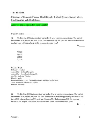 Test Bank for Principles of Corporate Finance 14th Edition by Richard Brealey, Stewart Myers, Franklin Allen and Alex Edmans Answers are at the end of each chapter
