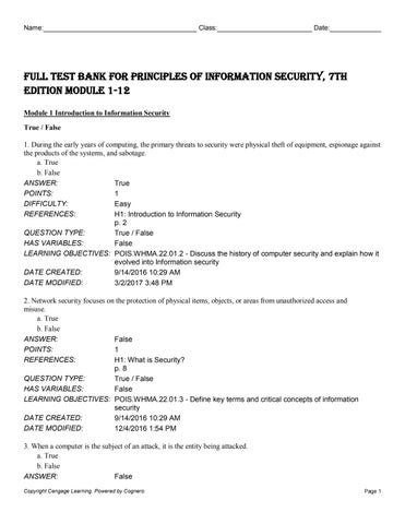 Full Test Bank for Principles of Information Security, 7th Edition Module 1-12 Module 1 Introduction to Information Security True / False 1. During the early years of computing, the primary threats to security were physical theft of equipment, espionage against the products of the systems, and sabotage. a. True b. False ANSWER: True POINTS: 1 DIFFICULTY: Easy REFERENCES: H1: Introduction to Information Security p. 2 QUESTION TYPE: True / False HAS VARIABLES: False LEARNING OBJECTIVES: POIS.WHMA.22.01.2 - Discuss the history of computer security and explain how it evolved into Information security DATE CREATED: 9/14/2016 10:29 AM DATE MODIFIED: 3/2/2017 3:48 PM 2. Network security focuses on the protection of physical items, objects, or areas from unauthorized access and misuse. a. True b. False ANSWER: False POINTS: 1 REFERENCES: H1: What is Security? p. 8 QUESTION TYPE: True / False HAS VARIABLES: False LEARNING OBJECTIVES: POIS.WHMA.22.01.3 - Define key terms and critical concepts of information security DATE CREATED: 9/14/2016 10:29 AM DATE MODIFIED: 12/4/2016 1:54 PM 3. When a computer is the subject of an attack, it is the entity being attacked. a. True b. False ANSWER: False Copyright Cengage Learning. Powered by Cognero.