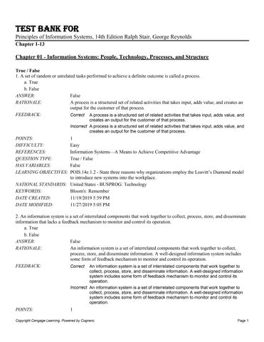 POINTS: 1 DIFFICULTY: Easy REFERENCES: Information Systems—A Means to Achieve Competitive Advantage QUESTION TYPE: True / False HAS VARIABLES: False LEARNING OBJECTIVES: POIS.14e.1.2 - State three reasons why organizations employ the Leavitt’s Diamond model to introduce new systems into the workplace. NATIONAL STANDARDS: United States - BUSPROG: Technology KEYWORDS: Bloom's: Remember DATE CREATED: 11/19/2019 5:59 PM DATE MODIFIED: 11/27/2019 5:05 PM 2. An information system is a set of interrelated components that work together to collect, process, store, and disseminate information that lacks a feedback mechanism to monitor and control its operation. a. True b. False ANSWER: False RATIONALE: An information system is a set of interrelated components that work together to collect, process, store, and disseminate information. A well-designed information system includes some form of feedback mechanism to monitor and control its operation. FEEDBACK: Correct An information system is a set of interrelated components that work together to collect, process, store, and disseminate information. A well-designed information system includes some form of feedback mechanism to monitor and control its operation. Incorrect An information system is a set of interrelated components that work together to collect, process, store, and disseminate information. A well-designed information system includes some form of feedback mechanism to monitor and control its operation.