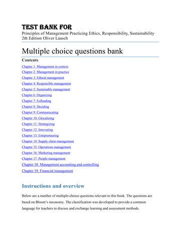 Multiple choice questions bank Contents Chapter 1: Management in context Chapter 2: Management in practice Chapter 3: Ethical management Chapter 4: Responsible management Chapter 5: Sustainable management Chapter 6: Organizing Chapter 7: Folleading Chapter 8: Deciding Chapter 9: Communicating Chapter 10: Glocalizing Chapter 11: Strategizing Chapter 12: Innovating Chapter 13: Entrpreneuring Chapter 14: Supply chain management Chapter 15: Operations management Chapter 16: Marketing management Chapter 17: People management