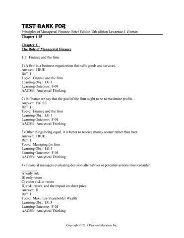 Test Bank For Principles of Managerial Finance, Brief Edition, 8th edition Lawrence J. Gitman Chapter 1-15 Chapter 1 The Role of Managerial Finance 1.1 Finance and the firm. 1) A firm is a business organization that sells goods and services. Answer: TRUE Diff: 1 Topic: Finance and the firm Learning Obj.: LG 1 Learning Outcome: F-01 AACSB: Analytical Thinking 2) In finance we say that the goal of the firm ought to be to maximize profits. Answer: FALSE Diff: 1 Topic: Finance and the firm Learning Obj.: LG 1 Learning Outcome: F-01 AACSB: Analytical Thinking 3) Other things being equal, it is better to receive money sooner rather than later. Answer: TRUE Diff: 1 Topic: Managing the firm Learning Obj.: LG 4 Learning Outcome: F-01 AACSB: Analytical Thinking 4) Financial managers evaluating decision alternatives or potential actions must consider ________. A) only risk B) only return C) either risk or return D) risk, return, and the impact on share price Answer: D Diff: 1 Topic: Maximize Shareholder Wealth Learning Obj.: LG 3 Learning Outcome: F-01 AACSB: Analytical Thinking 1 Copyright © 2019 Pearson Education, Inc.