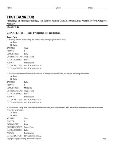 CHAPTER_01___Ten_Principles_of_economics True / False 1. Scarcity means that society has less to offer than people wish to have. A. True B. False ANSWER: True POINTS: 1 DIFFICULTY: Easy QUESTION TYPE: True / False HAS VARIABLES: False TOPICS: Introduction DATE CREATED: 11/16/2020 6:48 AM DATE MODIFIED: 11/16/2020 6:48 AM 2. Economics is the study of the circulation of money between banks, taxpayers and the government. A. True B. False ANSWER: False POINTS: 1 DIFFICULTY: Moderate QUESTION TYPE: True / False HAS VARIABLES: False TOPICS: Introduction DATE CREATED: 11/16/2020 6:48 AM DATE MODIFIED: 11/16/2020 6:48 AM 3. Economists study how individuals make decisions, how they interact with each other and the factors that affect the economy as a whole. A. True B. False ANSWER: True POINTS: 1 DIFFICULTY: Easy QUESTION TYPE: True / False HAS VARIABLES: False TOPICS: Introduction DATE CREATED: 11/16/2020 6:48 AM Copyright Cengage Learning. Powered by Cognero.