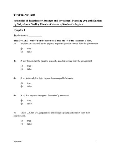 TEST BANK FOR Principles of Taxation for Business and Investment Planning 202 24th Edition by Sally Jones, Shelley Rhoades Catanach, Sandra Callaghan Chapter 1 Student name:__________ TRUE/FALSE - Write 'T' if the statement is true and 'F' if the statement is false. 1) Payment of a tax entitles the payer to a specific good or service from the government. ⊚ ⊚