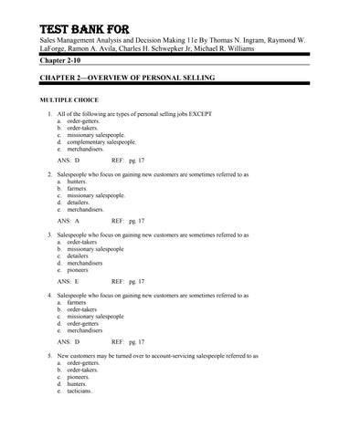 Test Bank For Sales Management Analysis and Decision Making 11e By Thomas N. Ingram, Raymond W. LaForge, Ramon A. Avila, Charles H. Schwepker Jr, Michael R. Williams Chapter 2-10 CHAPTER 2—OVERVIEW OF PERSONAL SELLING MULTIPLE CHOICE 1. All of the following are types of personal selling jobs EXCEPT a. order-getters. b. order-takers. c. missionary salespeople. d. complementary salespeople. e. merchandisers. ANS: D
