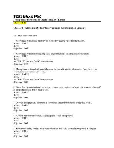 Test Bank For Selling Today Partnering to Create Value, 16tHEdition Chapter 1-17 Chapter 1 Relationship Selling Opportunities in the Information Economy