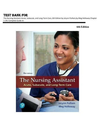 Download the complete Test Bank for The Nursing Assistant: Acute, Subacute, and Long‑Term Care, 6th Edition by JoLynn Pulliam and Meg Holloway, covering Chapters 1–24. This comprehensive academic resource is designed to support students and instructors with structured, exam‑ready assessment materials aligned with the official textbook content.