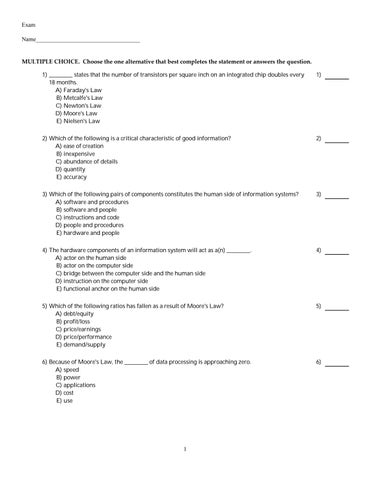 MULTIPLE CHOICE. Choose the one alternative that best completes the statement or answers the question. 1) ________ states that the number of transistors per square inch on an integrated chip doubles every 18 months. A) Faraday's Law B) Metcalfe's Law C) Newton's Law D) Moore's Law E) Nielsen's Law