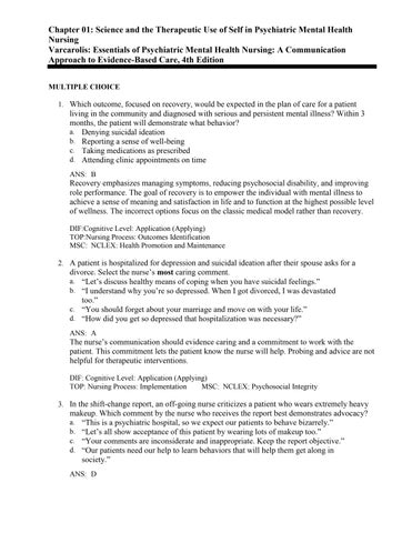 Chapter 01: Science and the Therapeutic Use of Self in Psychiatric Mental Health Nursing Varcarolis: Essentials of Psychiatric Mental Health Nursing: A Communication Approach to Evidence-Based Care, 4th Edition MULTIPLE CHOICE 1. Which outcome, focused on recovery, would be expected in the plan of care for a patient