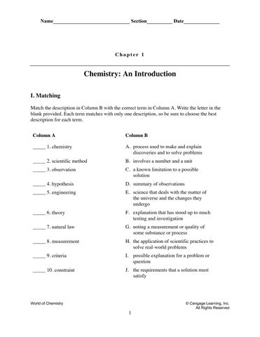 Chemistry: An Introduction I. Matching Match the description in Column B with the correct term in Column A. Write the letter in the blank provided. Each term matches with only one description, so be sure to choose the best description for each term. Column A