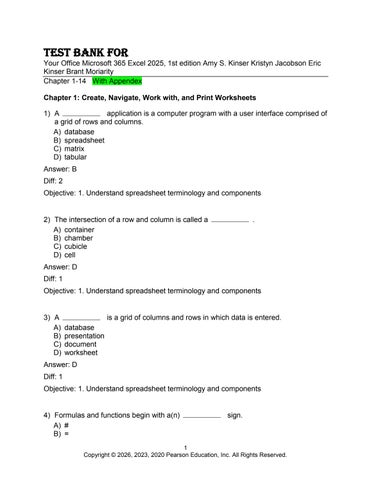 Test Bank For Your Office Microsoft 365 Excel 2025, 1st edition Amy S. Kinser Kristyn Jacobson Eric Kinser Brant Moriarity Chapter 1-14 With Appendex Chapter 1: Create, Navigate, Work with, and Print Worksheets 1) A application is a computer program with a user interface comprised of a grid of rows and columns. A) database B) spreadsheet C) matrix D) tabular Answer: B Diff: 2 Objective: 1. Understand spreadsheet terminology and components