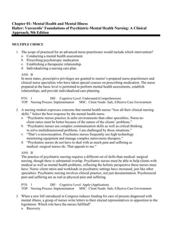Chapter 01: Mental Health and Mental Illness Halter: Varcarolis’ Foundations of Psychiatric-Mental Health Nursing: A Clinical Approach, 9th Edition MULTIPLE CHOICE 1. The scope of practiced for an advanced nurse practitioner would include which intervention? a. Conducting a mental health assessment. b. Prescribing psychotropic medication. c. Establishing a therapeutic relationship. d. Individualizing a nursing care plan. ANS: B
