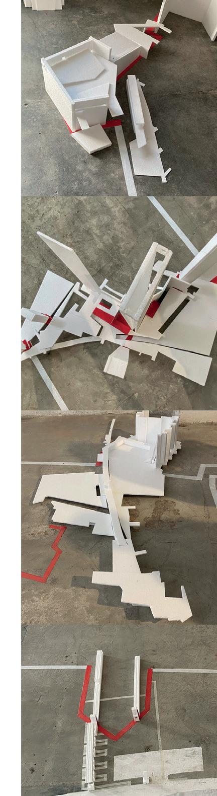 and design in the workshop. From this interpreta tive approach, the idea that intermediation can be built from the topographic thickness that defines the site began to emerge, considering it either as geological matter, as a symbolic representation of a modern defensive wall, or as a potential gate to be crossed to discover multiple connections. “Living together” is thus a starting point to build a new system of more open relationships between the spaces that surround the battery, linking it to the beach and to the urban park and offering new connections between the promontory’s upper level and the riverside cliffs. It is also an invitation to rediscover the extended territorial relations that can be read, interpreted, and valued from that converging point: from Tróia to São Luís hills, from the Palace of Comenda to the water reservoir of the Bela Vista neighborhood, from the Outão Fort to the mills surrounding São Filipe Fort hills… New possibilities of approach, interaction and per manence are opened, in a dialogue with the material memory of the site, projecting the real and the im aginary lines of a potential new nautical chart of the 21st century’s Setúbal. The curious and stimulating proposal here presented would admit multiple readings and interpretations, but the aspect we would like to highlight is the ex traordinary ability it offers to develop at different scales: territorial, urban, and architectural/sculptural. The territorial scale would be emphasized through the long-distance visual relations between out standing landscape elements, axially drawn between Albarquel and Tróia’s roman archeological site, the Fort of Outão and Bela Vista neighborhood. The urban scale would be defined by the new artifact’s relationship with its most immediate sur roundings. Particularly, it would be materialized as a physical and visual urban connector between the hills and the river, facilitating a smooth East-West