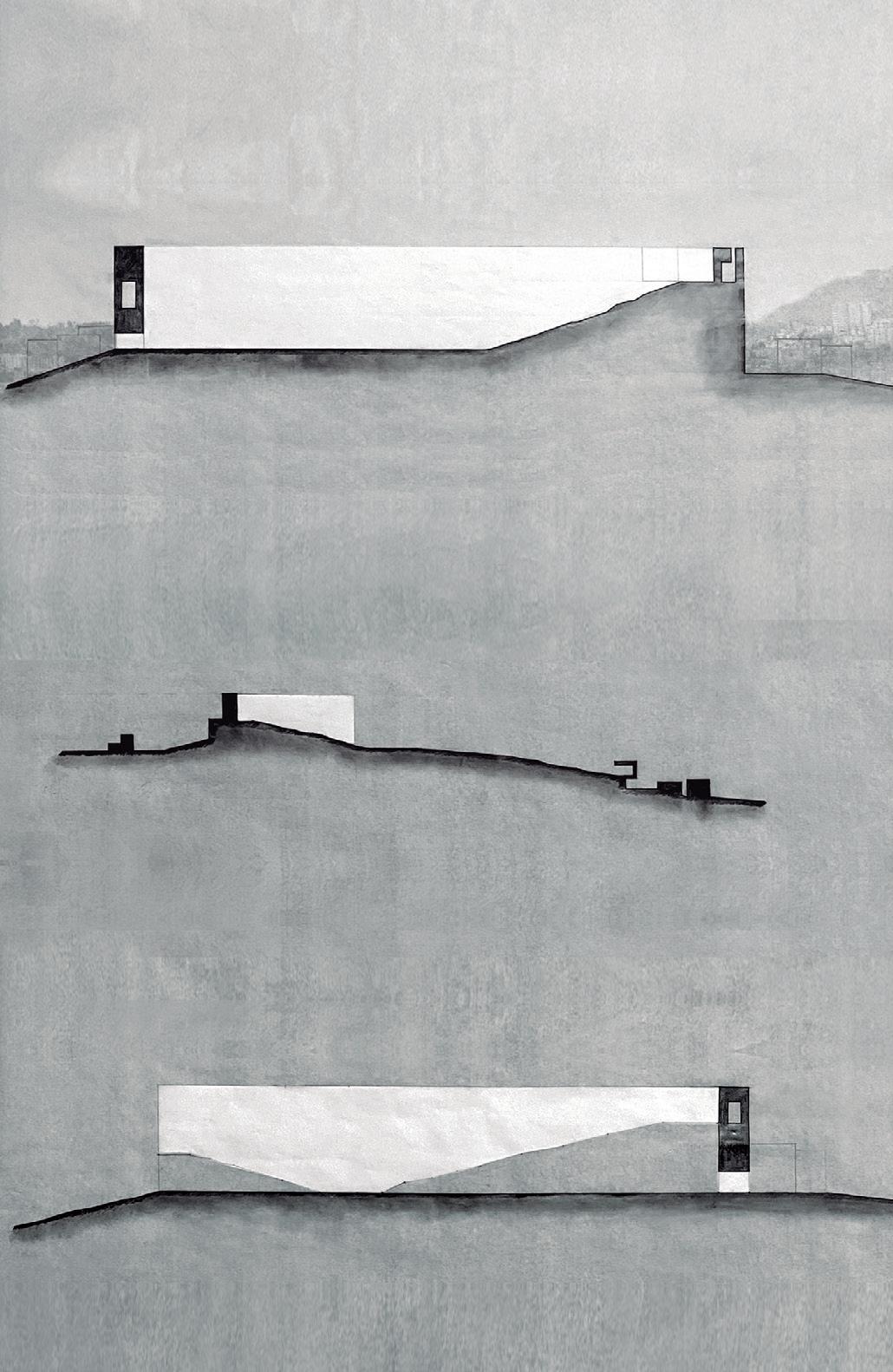 transition between Albarquel beach and the urban park, thus suggesting a new topographic thickness. The architectural/sculptural scale would result in the creation of a new public, hybrid, and complex space. A multilevel artifact that subtly redesigns the battery’s surface, somewhere between the park and the square, establishing new continuities with the galleries and other underground systems. On the promontory’s lower levels, three new axes charac terized by different types of lighting are excavated, intersecting, and partially opening the pre-existing military galleries.