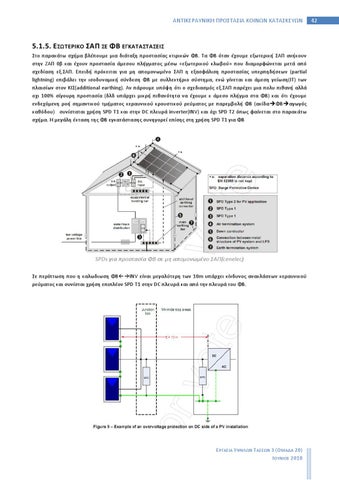 5.1.5. ΕΣΩΤΕΡΙΚΟ ΣΑΠ ΣΕ ΦΒ ΕΓΚΑΤΑΣΤΑΣΕΙΣ Στο παρακάτω σχήμα βλέπουμε μια διάταξη προστασίας κτιρικών ΦΒ. Τα ΦΒ όταν έχουμε εξωτερική ΣΑΠ ανήκουν στην ΖΑΠ 0β και έχουν προστασία άμεσου πλήγματος μέσω «εξωτερικού κλωβού» που διαμορφώνεται μετά από σχεδίαση εξ.ΣΑΠ. Επειδή πρόκειται για μη απομονωμένο ΣΑΠ η εξασφάλιση προστασίας υπερπηδήσεων (partial lightning) επιβάλει την ισοδυναμική σύνδεση ΦΒ με συλλεκτήριο σύστημα, ενώ γίνεται και άμεση γείωση(ΙΤ) των πλαισίων στον ΚΙΣ(additional earthing). Αν πάρουμε υπόψη ότι ο σχεδιασμός εξ.ΣΑΠ παρέχει μια πολυ πιθανή αλλά οχι 100% σίγουρη προστασία (δλδ υπάρχει μικρή πιθανότητα να έχουμε κ άμεσο πλήγμα στα ΦΒ) και ότι έχουμε ενδεχόμενη ροή σημαντικού τμήματος κεραυνικού κρουστικού ρεύματος με παρεμβολή ΦΒ (ακίδαΦΒαγωγός καθόδου) συνίσταται χρήση SPD T1 και στην DC πλευρά inverter(INV) και όχι SPD T2 όπως φαίνεται στο παρακάτω σχήμα. Η μεγάλη έκταση της ΦΒ εγκατάστασης συνηγορεί επίσης στη χρήση SPD T1 για ΦΒ