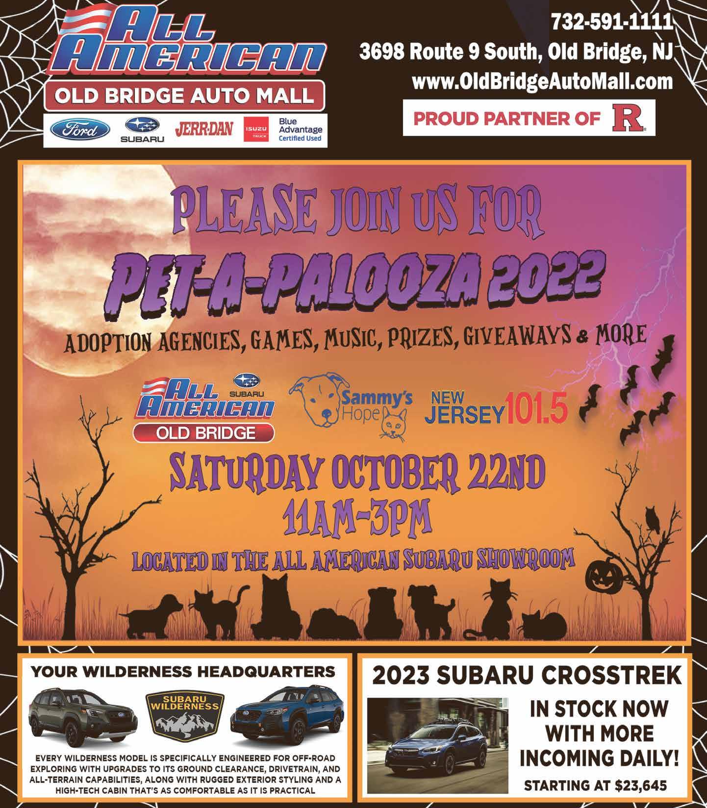home and this year is gearing up to be the biggest one yet! There will be many local shelters and adoption agencies, along with pet-friendly vendors that will be on site to help support the event. The NJ101.5 Yellow Van will be at the event with give aways, music and the always popular Cutest Pet Contest with huge prizes. In addition, there will also be games, crafts, and the Friendly’s ice cream truck will be on site as well. This has always been a favorite event of All American Subaru’s and they are so excited to bring it back once again. Pet-A-Palooza 2022 is sure to be a great outing for the entire family so be sure to stop by and possibly even take home a new furry friend!