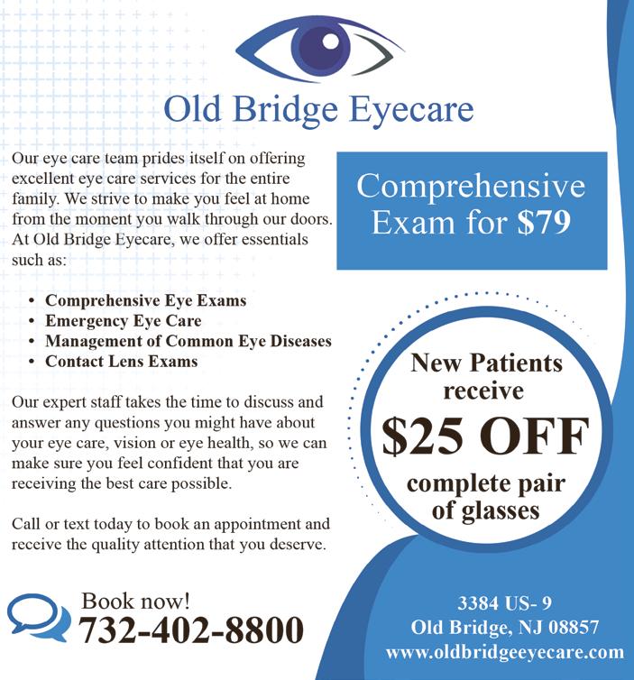 TO ADVERTISE CALL 888-523-4331 10 JUNE 2024 ALL AROUND PUBLICATIONS SKIP THE ER. AFC WILL GET YOU IN AND OUT QUICKLY. 1120 US Highway 9, Old Bridge 732.200.7800 | afcurgentcare.com/old-bridge ALL NJ MEDICAID PLANS ACCEPTED IN WALMART SHOPPING CENTER
