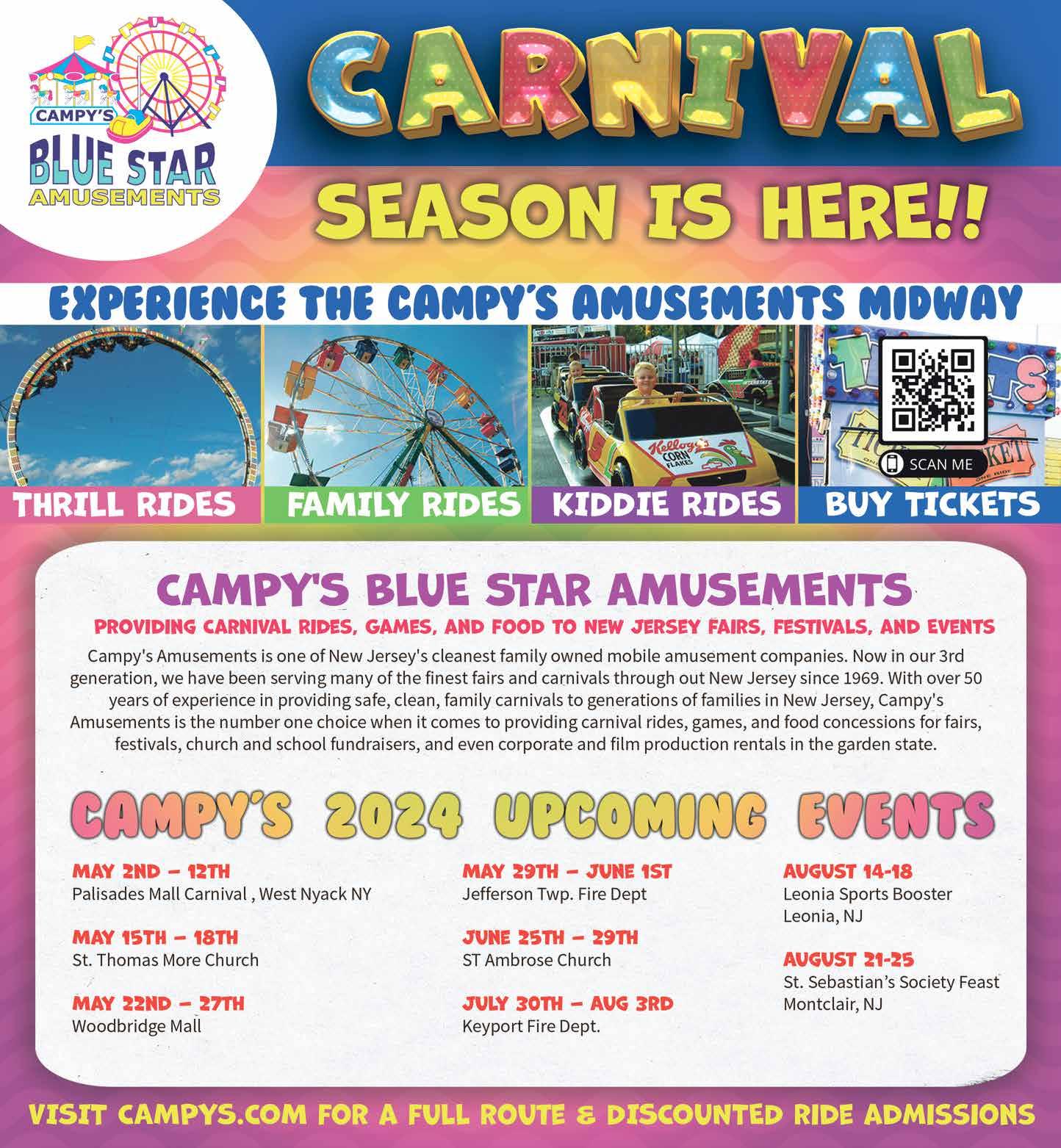 tions in Old Bridge & Matawan, and must be purchased before June 24th. This year, we are happy to offer a Super Mega-Pass for $100.00 for all 5 nights of unlimited rides, (a limited number available) only available on line at www.campys.com.