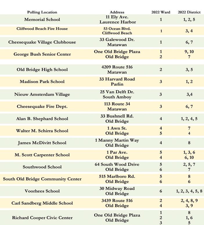 As a reminder, Election Day is on Tuesday, No vember 8th. Polls will be open from 6am until 8pm. Early Voting will take place on Saturday, October 29th through Sunday, Novem ber 6th at the Old Bridge Municipal Library. The hours of operation will be Monday through Saturday, 10am – 8pm and Sunday, 10am – 6pm. The last day to register to vote for the general election is Tuesday, October 18th. Forms can be obtained at the Municipal Clerk’s Office. Please call 732-721-5600 ext. 2200.