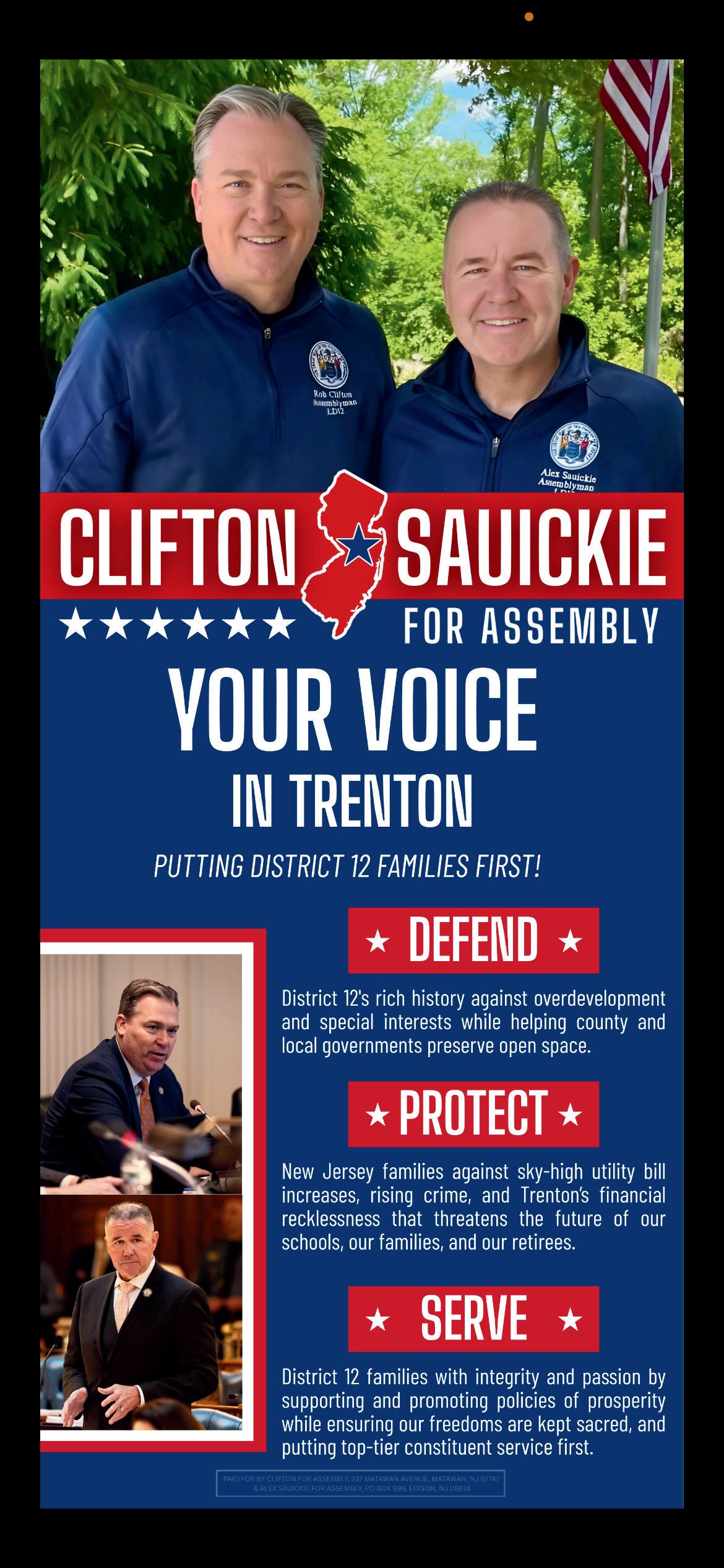 In the Assembly, Clifton and Sauickie are leading the fight against the disastrous policies of the far-left Democrat majority in Trenton, that have made New Jersey unaffordable for the seniors and hard working families in LD12.