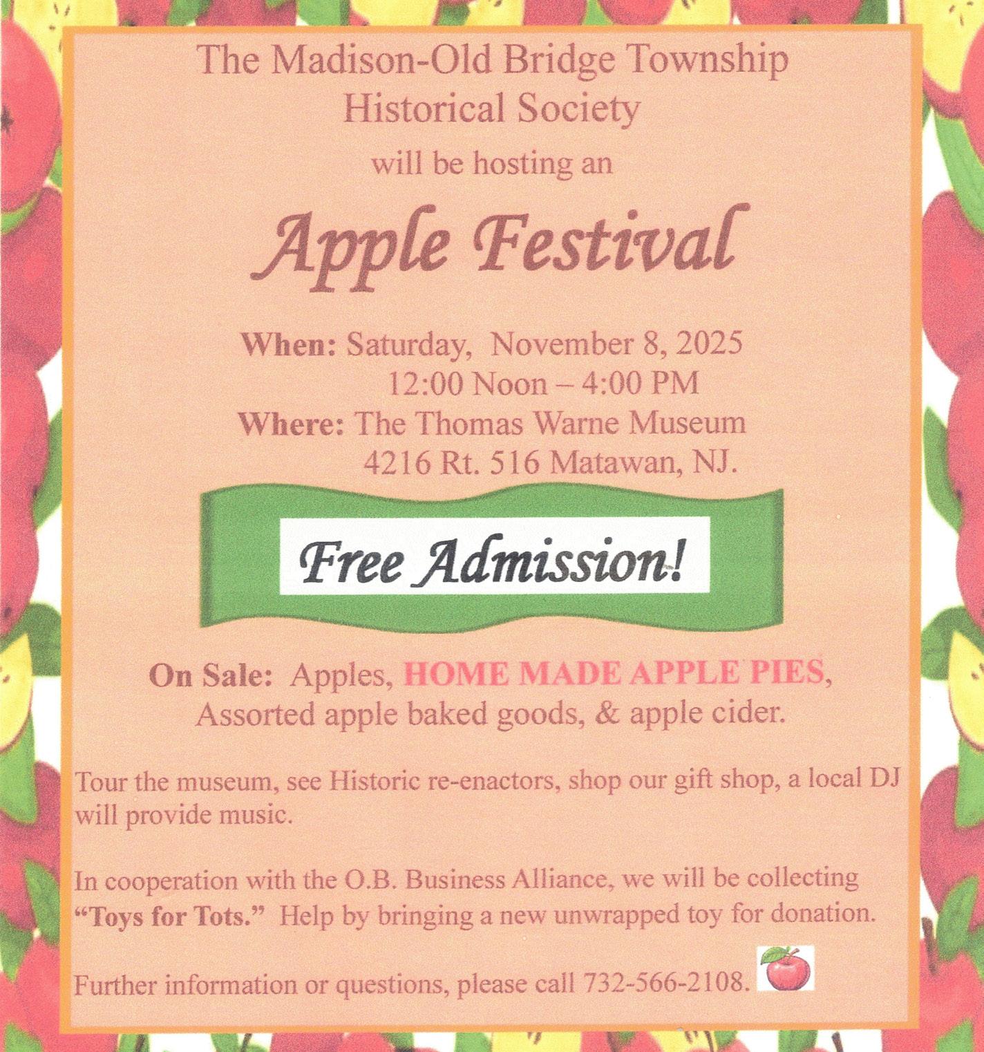 The 58th annual family-friendly Apple Festival will take place on Saturday, November 8th from 12pm-4pm at the Thomas Warne Museum. This event, presented by the Madison-Old Bridge Township Historical Society, will include delicious apple pies, assorted baked goods, and refreshments. This is the perfect family event to help kick off the holiday shopping season. They will also be collecting new unwrapped toys to donate to Toys for Tots.