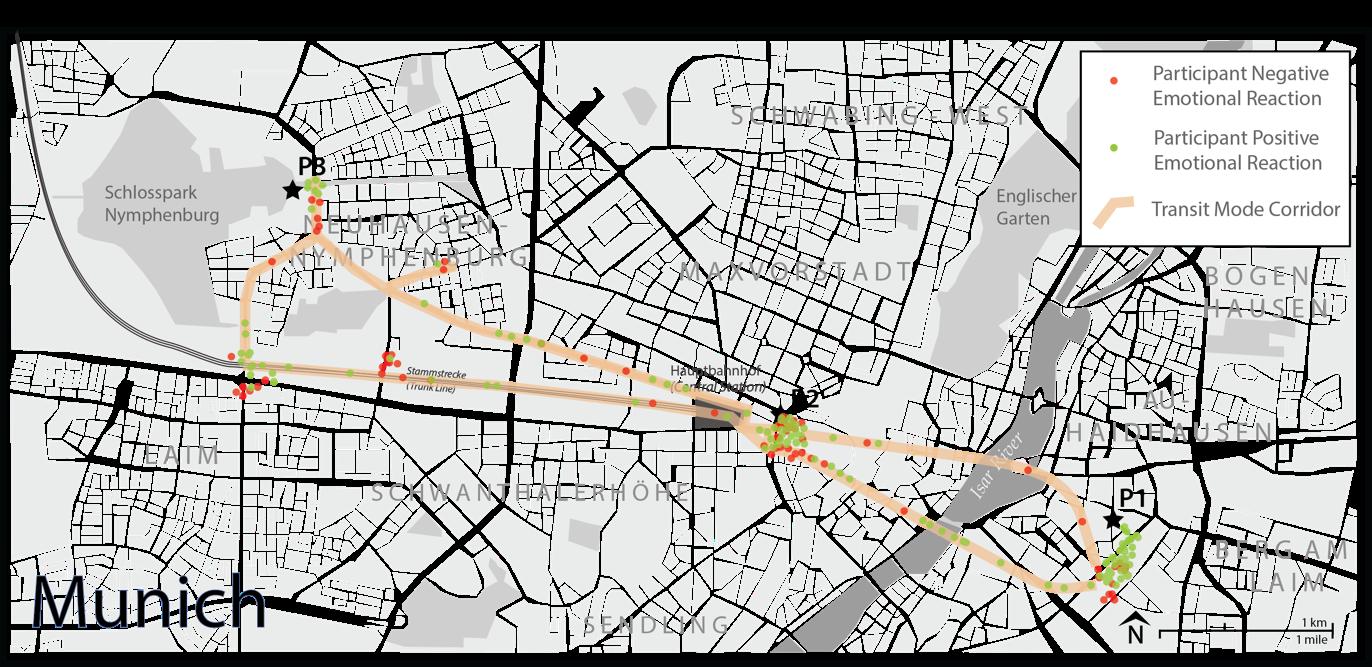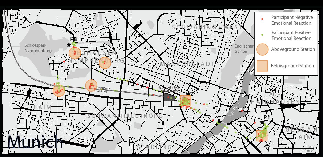 Users of public transit tend to avoid certain routes because they dislike particular aspects, or gravitate towards a particular mode because it is familiar, or because it “feels right” This type of navigation can be described as ‘ ayfeeling’ , or letting one’s senses guide the way. The concept of ayfeeling is integral to understanding how public transit space is used, and underscores the importance of emotional wellbeing within these spaces. But how does one determine what wayfeeling is and when it is being performed? The aim of this paper is to illuminate how emotional wellbeing affects navigational behaviors through the act of wayfeeling. The study uses participant experiences of a Destination-Task Investigation (DTI) in Munich’s public transit system. Included in the DTI, participants were asked to draw their navigational journey, and then asked to highlight the sections they found positive, neutral, and negative. The study revealed that the act of navigating a transit space evokes strong emotional reactions from participants, especially as they had more negative experiences in transfer areas, and felt more positive in familiar spaces. Most importantly, negative events during the DTI overshadowed the overall perception of their journey which lead to an overall negative opinion of their experience.