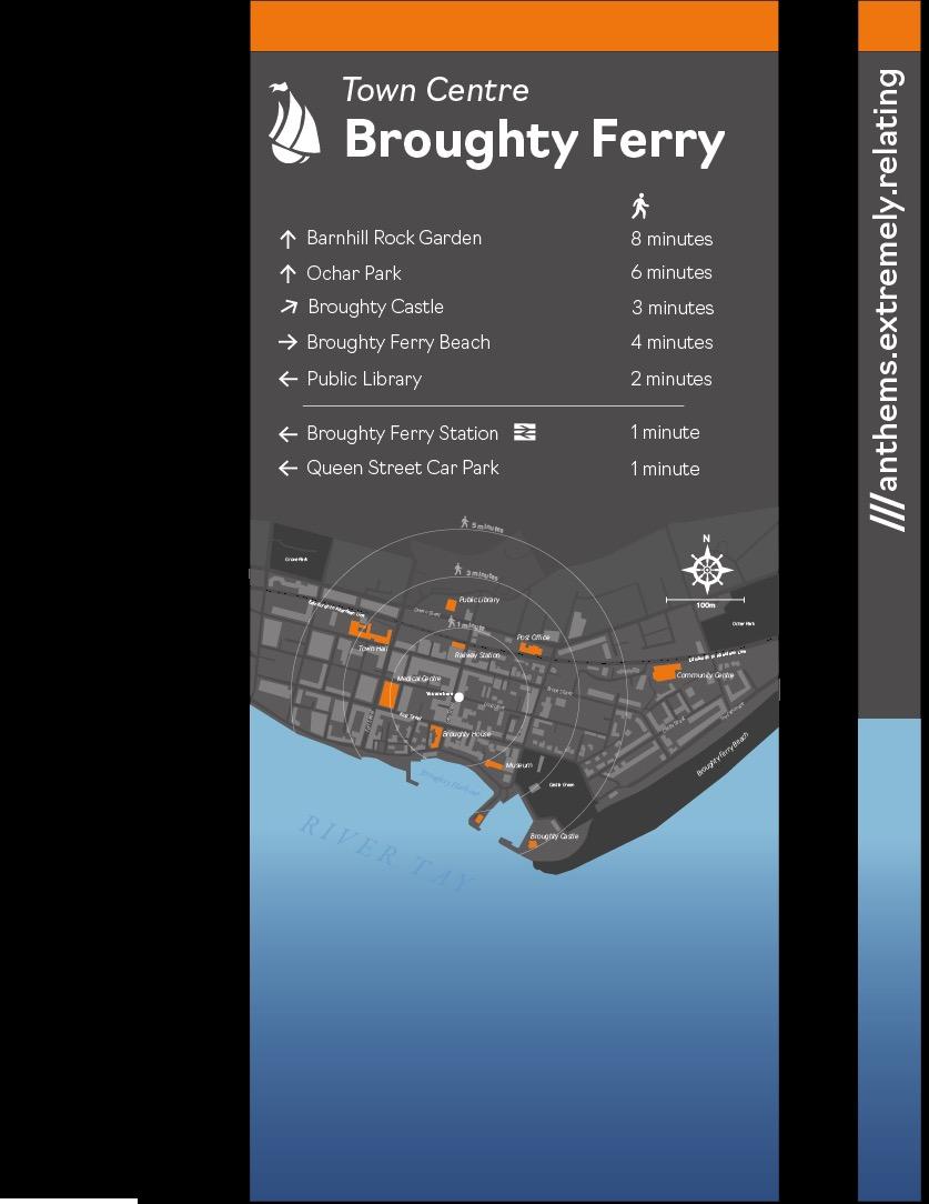 This Concept Design presents an exciting opportunity to revitalise wayfinding within the beautiful town of Broughty Ferry. Broughty Ferry is located east of Dundee and sits on the north bank the River Tay. An historic fishing town, Broughty Ferry offers people a chance to experience a variety of cafes and restaurants, explore local beaches and coastal paths, and enjoy the refreshing waters of the Tay. The proposed wayfinding family of signs is made up of five distinctive types: Plinths, Waymarkers (both large and small), Destination Signs, and Fingerpost Signs.