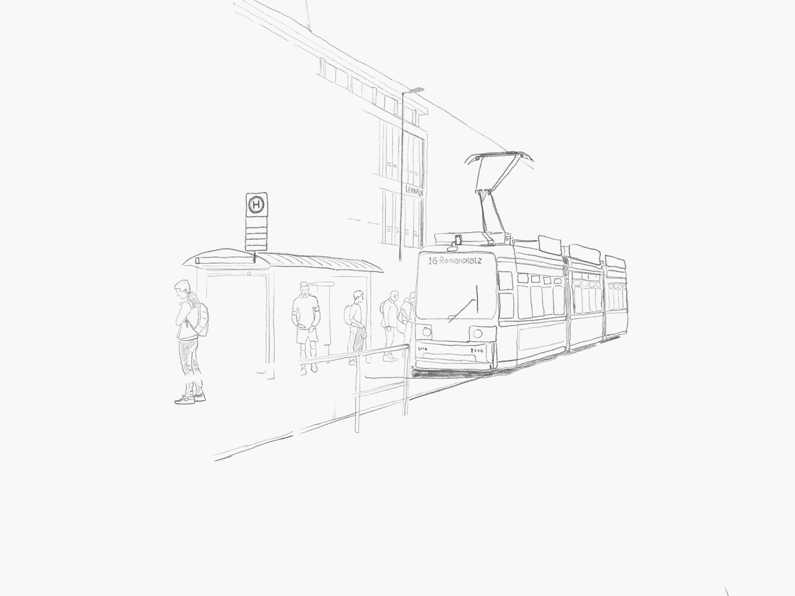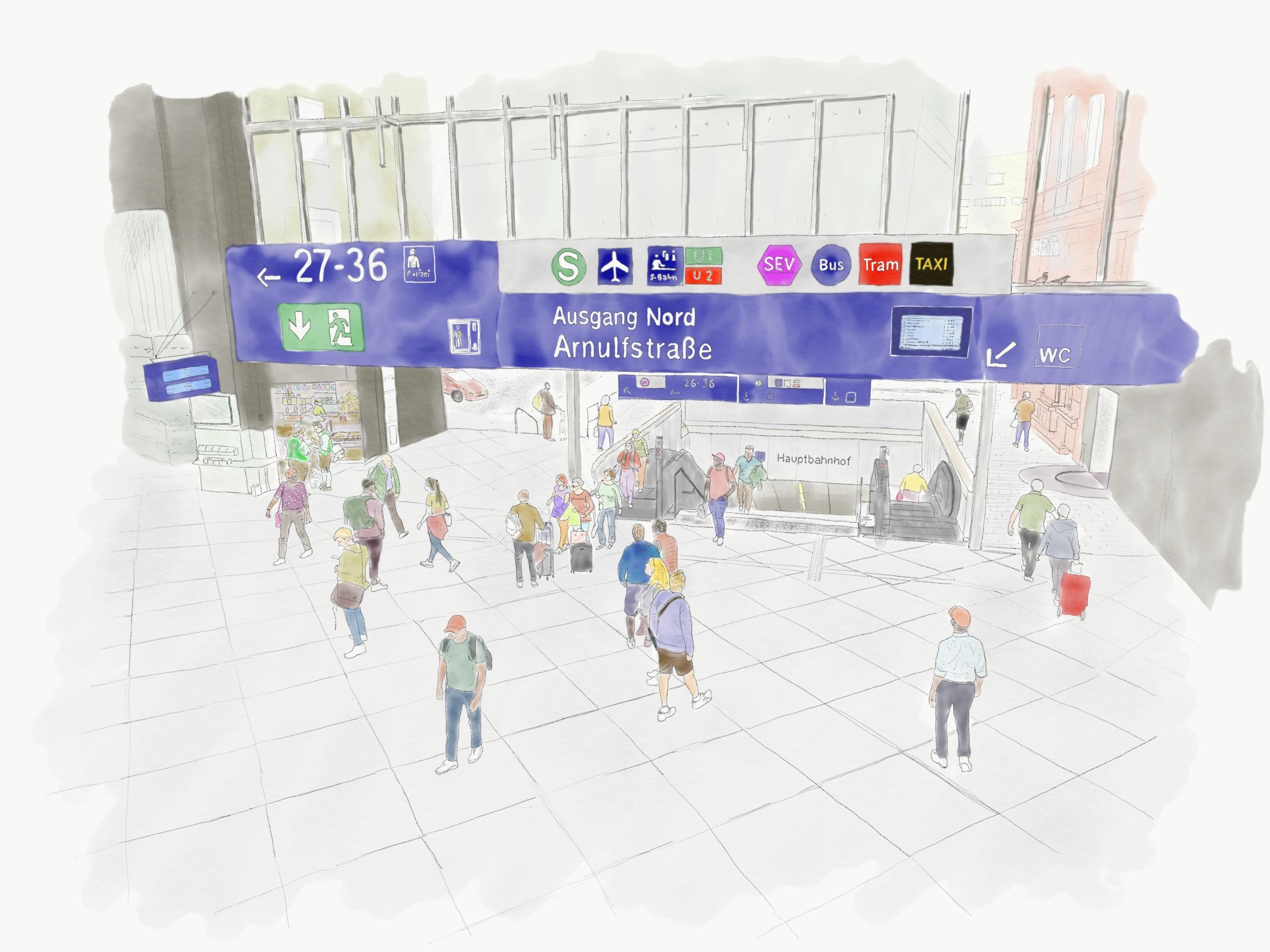 BOTTOM LEFT: Two images of the Munich transport system – one sketch of people waiting for a tram, the other a coloured drawing of the busy Hauptbahnhof (Central Station).